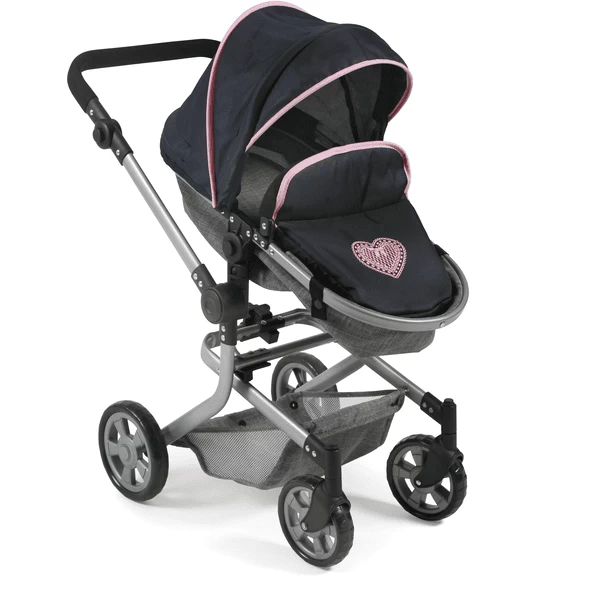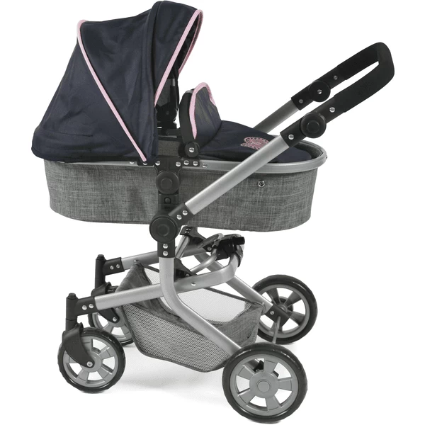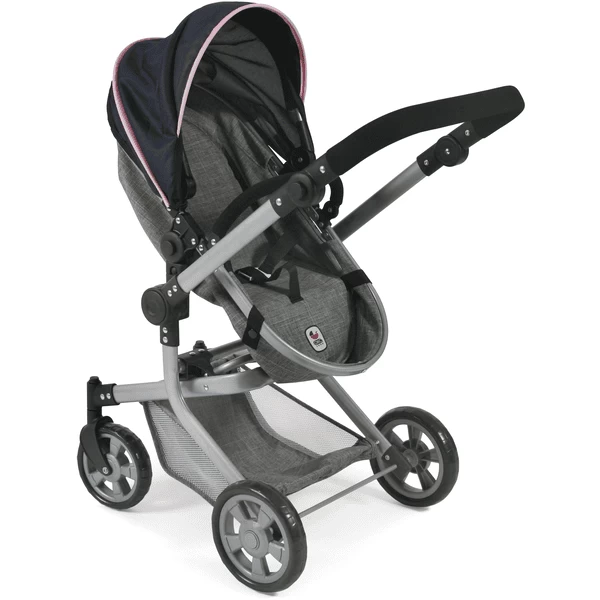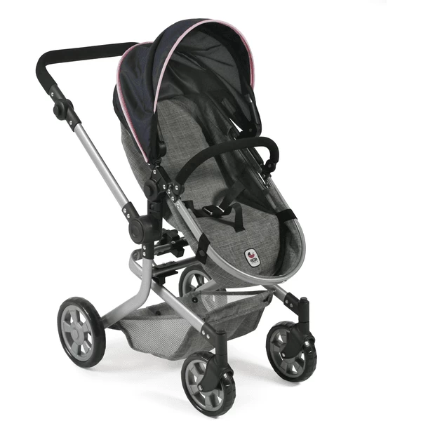 De zwenkbare voorwielen maken het nemen van bochten kinderspel. De sportstoel heeft een veiligheidsbeugel en kan eenvoudig worden omgebouwd tot een badkuipbevestiging met een vlak ligvlak. De hoes van het babybadje dient ook als windkapje voor de sportstoel. De sportstoel of het babybadje kan aan beide zijden worden bevestigd, zowel in de rijrichting als met het oog op de moeder van de pop. De duwbeugel is in hoogte verstelbaar van ca. 47 tot 80 cm en past zich dus aan bijna elke lichaamsgrootte aan. Bovendien kan de duwer worden gezwenkt, zodat de poppenwagen aan beide zijden kan worden gereden. Met luifel en bagagenet voor diverse gebruiksvoorwerpen. De Kombi Mika kan bijzonder gemakkelijk en klein worden opgevouwen.