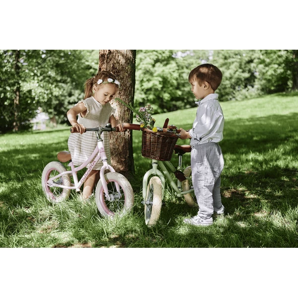 De chique beginnersfiets geeft onze kleintjes vanaf 3 jaar veel rijplezier en overtuigt – licht en compact – zelfs de meest veeleisende ouders. Dankzij het stalen frame met een lage instap kunnen kinderen gemakkelijk op de fiets stappen en meteen beginnen te trappen. Bovendien zorgen de zacht gevoerde handvatten van imitatieleer ervoor dat tere kleine handjes er niet afglijden. Balance vasthouden? Kinderspel! Want de ergonomisch gevormde zitting van kunstleer houdt zelfs vlieggewichten stevig in het zadel. Net als het stuur is het zadel in hoogte verstelbaar. Dus de trendy runabout zal volgend seizoen zeker deel uitmaken van de familievloot. En waar twee keer retro klinkt, zijn pasteltinten niet ver weg. Poederroze, hemelsblauw en delicaat mint zetten de toon. En er zijn hoogwaardige zachte banden in de trendy nostalgische look Style .