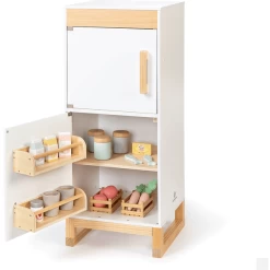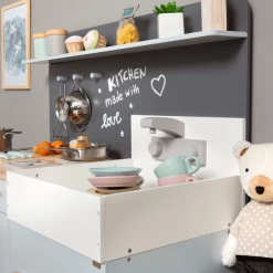 - Inbegrepen: Oven, magnetron, servieskast, koelkast met magnetische deuren, knoppen met geluid, roestvrijstalen spoelbak, klok en schoolbord.