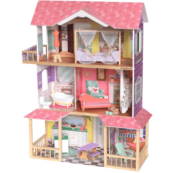 Het lichte en energieke poppenhuis Viviana by KidKraft is een welkome plek voor 30 cm hoge poppen Ze genieten van de wind op de omliggende veranda op de begane grond, of vanaf het balkon op de derde verdieping Een gedetailleerde wenteltrap leidt naar de ruime slaapkamer met elegant hemelbed op de bovenverdieping Volledig ingericht met alle comfort van een gezellig huis, deze haciënda is klaar om in te trekken en klaar om vele blijvende herinneringen te creëren