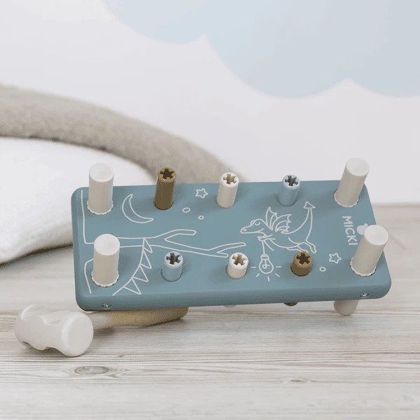 - Micki s populaire houten speelplank met hamer is een klassiek houten speelgoed dat zowel het speelinstinct stimuleert als de fijne motoriek van het kind traint.