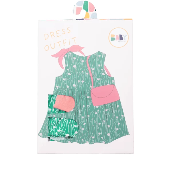 - De set bestaat uit een groen gebloemde jurk, een roze haarband met klittenbandsluiting en een roze handtas.