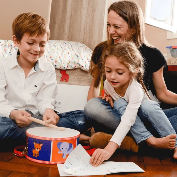 - De kindertrommel wordt ook geleverd met een belletjesarmband om samen ritmes te maken