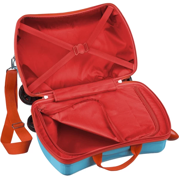 De kinderen kunnen op het wagentje zitten, zich aan de handgrepen vasthouden en het tijdens de wachttijd als schuifwagentje gebruiken. De twee 360° wielen maken de trolley bijzonder flexibel en garanderen schuifplezier aan alle kanten. Bovendien biedt de trolley veel ruimte voor speelgoed en andere reisbenodigdheden dankzij de praktische indeling met ritsvak en dwarsbanden. De trolley kan comfortabel worden gedragen met de afneembare schouderriem. De koffer kan ook in de handbagage worden meegenomen.