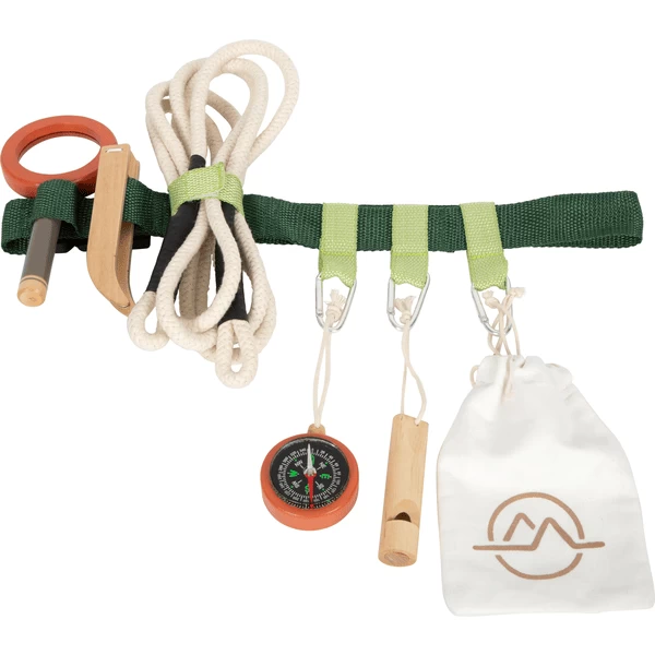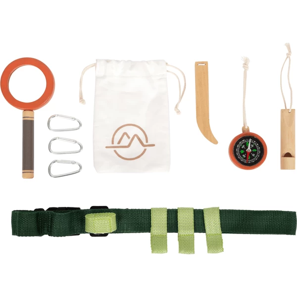 - De uitrusting van de ontdekkingsreiziger, bestaande uit een houten fluitje, een vergrootglas, een pincet, een kompas, een touw en een katoenen opvangzak, kan gemakkelijk aan de gordel worden bevestigd met behulp van lussen, treklussen en karabiners.