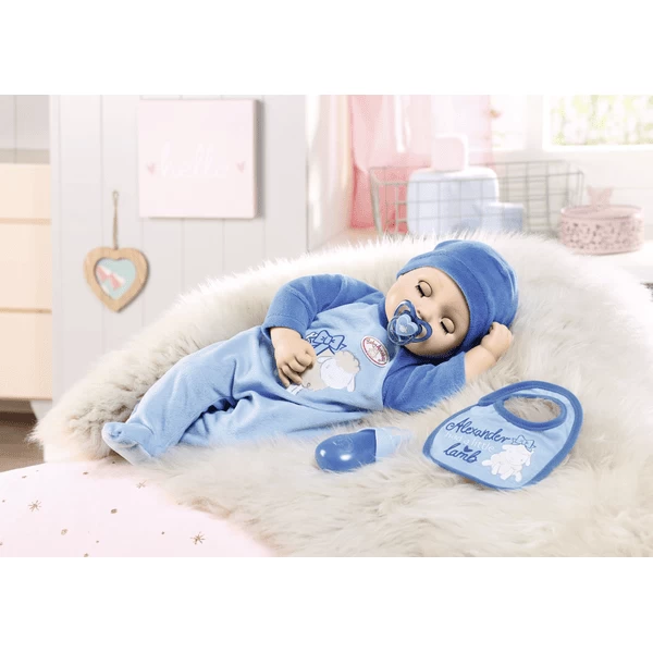 Alexander is een echte flessenbaby en zuigt op zijn blauwe fles met mondbewegingen en drinkgeluiden. Als het voeden niet snel genoeg gaat, vloeien er echte poppentranen en huilt Alexander hartverwarmend. Maar hij komt snel weer tot rust met allerlei activiteiten. Zijn favoriete bezigheid is om “hop, hop, hop” te spelen en vrolijk te lachen.